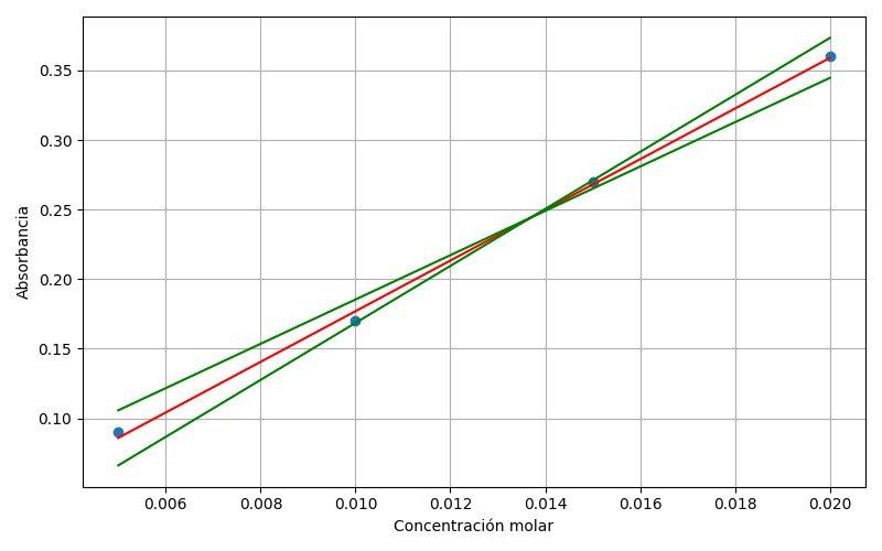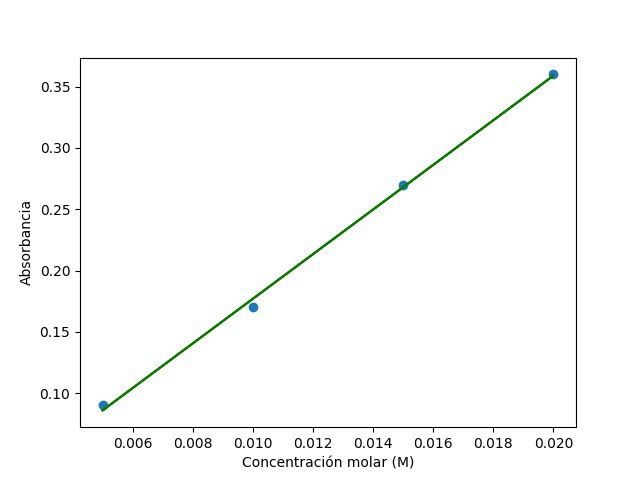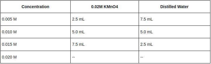 Different dilutions were obtained from a 0.2M KMnO4 solution in order to build a calibration curve. To prepare the dilutions for a four points calibration curve, you can use the volumes of the following table: