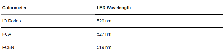 To measure the absorbance of the calibration curve dilutions and the soil samples we used the IO Rodeo colorimeter and two self built colorimeters based on the previous old version of IO Rodeo. The measurement protocol suggest a 550nm light source, however we did not have LEDs emitting in that wavelength. We used the 520nm led for the IO Rodeo colorimeter and the green light of an RGB LED for the other two colorimeters. To know the emission spectrum and peak emission of those green LEDs we tested them on a commercial UV1800 Shimadzu UV-VIS spectrophotometer. You can find more details of the LED emission test here.