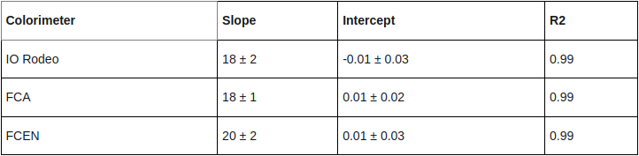 With these results we built a linear regression and calculated the error of the regression parameters with a Python script for each colorimeter.